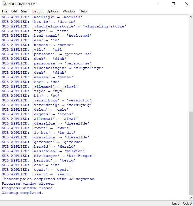 Together with their unique, spontaneous words, each speaker also gave a unique speaking pattern. One speaker has a sing-song sort of voice and does not really allow herself a pause after a period. Another amuses themselves so much that most sentences end in a laugh. One has a stutter when he slows down to think. Another speeds up and falls into false starts when dealing with emotions. All of them tripped Whisper up in unique ways, so I ended up creating not only a master subs file, but also eight speaker pattern files. Currently, depending on speaker style, my Whisper accuracy shot up to between 60 and 80% in Afrikaans, a far cry from the initial 10 to 15%.