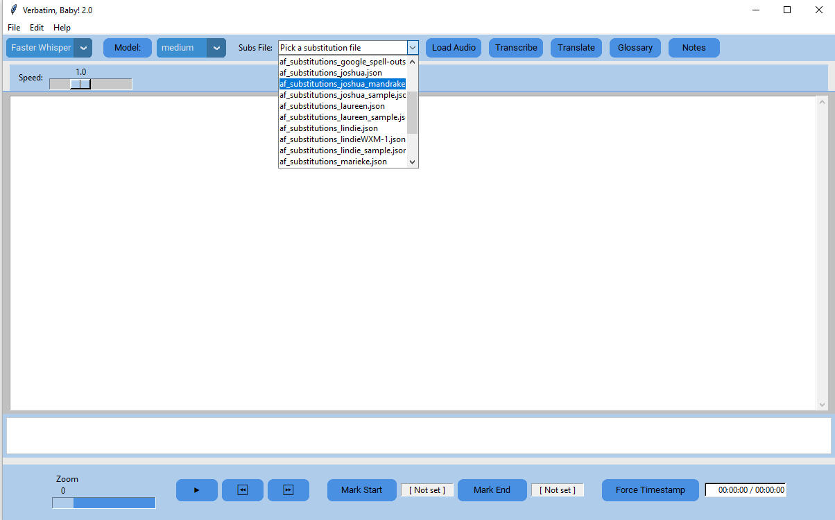 Once I overcame the offense, I decided to investigate the issue. I spoke to Afrikaans transcribers, and all of them scoffed at Afrikaans ASR, calling it garbage and a waste of time. I mean, I can see why, but surely there had to be a way around it. There was: Substitution files. First, we created a placeholder selector on the toolbar, and then it took a few days to get the system to recognize and use the selected file, but when it did, it was really sweet.